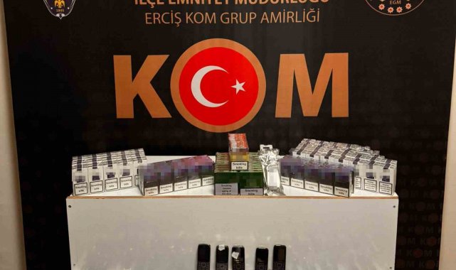 Erciş Cumhuriyet Savcısının talimatları doğrultusunda, Erciş KOM Büro Amirliği ekiplerince operasyon düzenlendi. Düzenlenen operasyonda bir iş yerinde yapılan aramada, tamamı gümrük kaçağı olan 5 adet cep telefonu, 79 adet kol saati, 5 adet elektronik sigara, 450 adet puro, 126 paket sigara ele geçirildi.