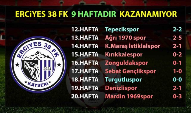 Türkiye 3. Lig ekiplerinden Erciyes 38 Futbol Kulübü, oynadığı son 9 maçta galibiyet alamadı. Mavi siyahlılar, sadece 2 maçtan puan çıkarabildi.