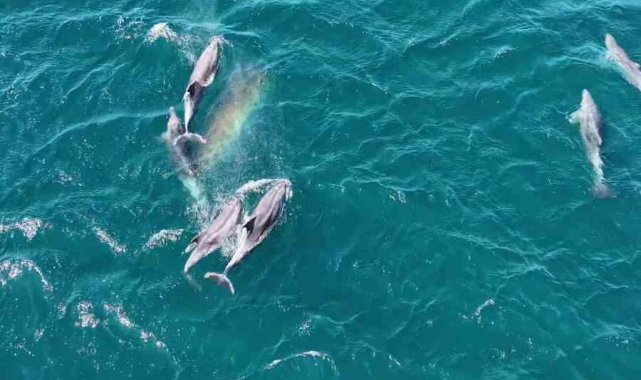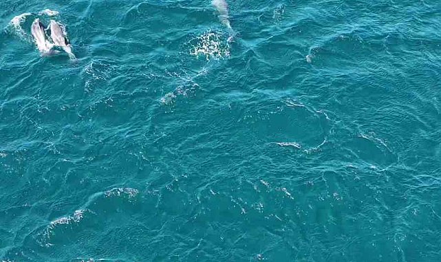 Erdek Körfezi'nde 6 adet yunus, suyun altında kaybolup tekrar yüzeye çıkarak adeta görsel şölen sundu. O anlar dronla da kaydedilirken, yunuslar kısa süre sonra gözden kayboldu.