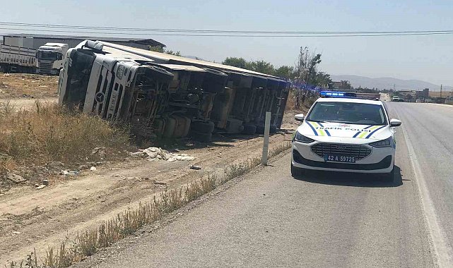 Konya'nın Ereğli ilçesinde kontrolden çıkan tır devrilirken, sürücü kazayı hafif sıyrıklarla atlattı.