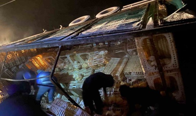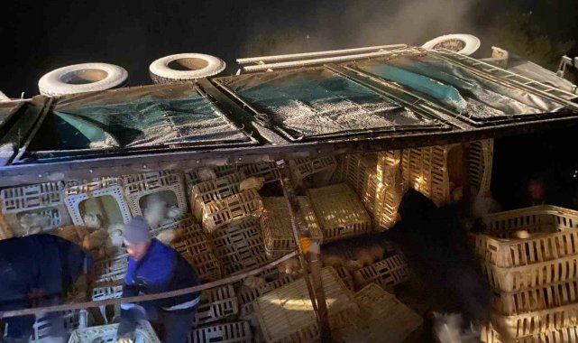 Kamyondan savrulan ve plastik kasalara sıkışan yüzlerce tavuk telef oldu. Kazada canlı kalan tavuklar ise başka bir kamyona nakledildi. Kamyonun kasasında toplam 3 bin canlı tavuğun bulunduğu öğrenildi.