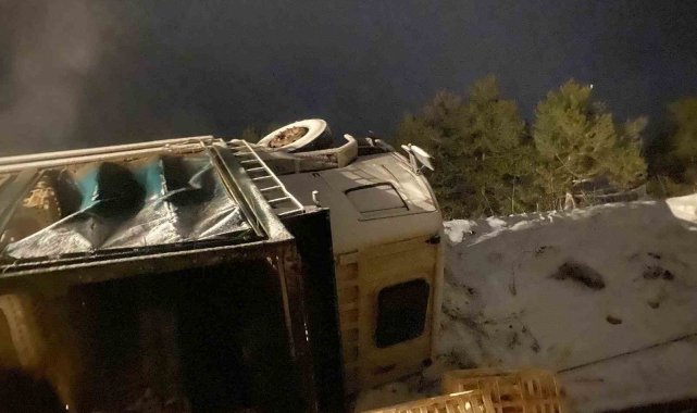 Bolu'da karlı yolda virajı alamayan Erpiliç firmasına ait canlı tavuk nakil kamyonu devrildi. Kazada sürücü yaralanırken, yüzlerce tavuk telef oldu.