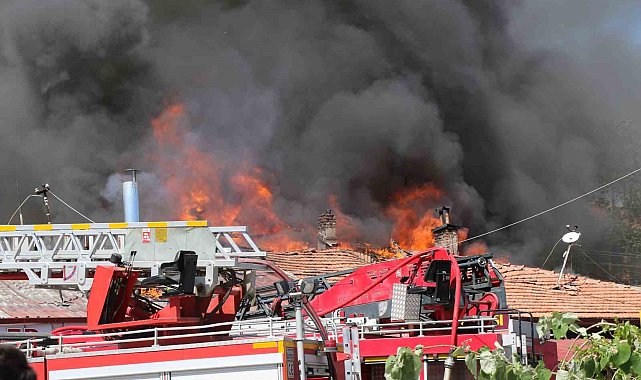 Erzincan'da Buğday Meydanı'nda ahşaptan sıralı dükkanların çatısında çıkan yangına müdahale ediliyor.