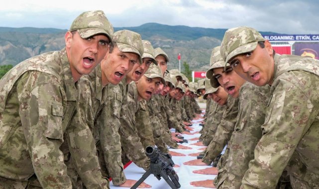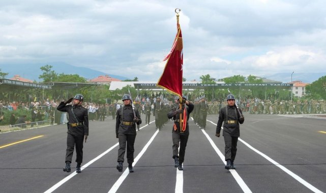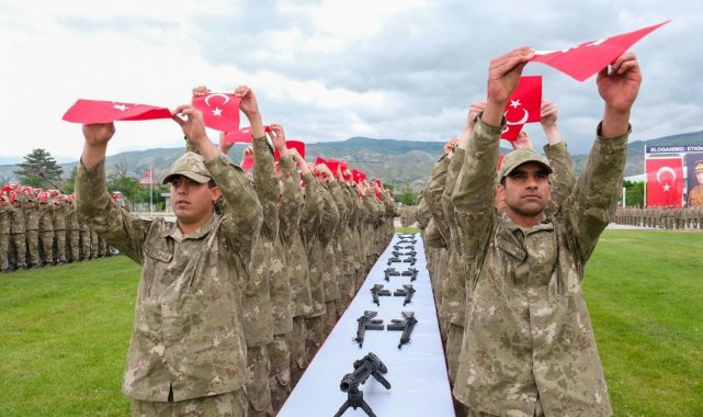 Silahlar ve Türk bayraklarının bulunduğu masaların etrafında sıralanan askerler, Türk bayrağı ile silah üzerine el basarak yemin etti.