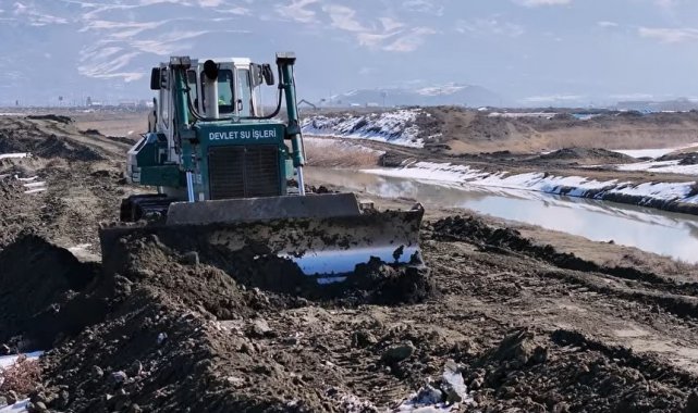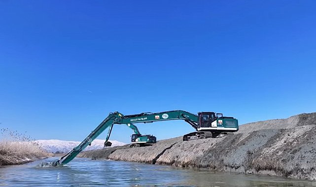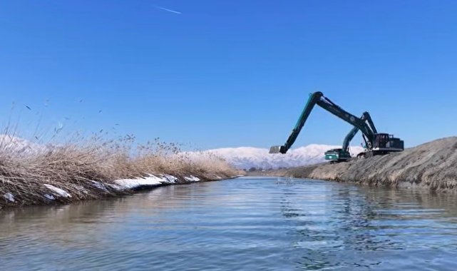 DSİ 8. Bölge Müdürlüğü ekiplerince gerçekleştirilen temizlik çalışmasında tahliye kanallında biriken toprak ve çamur yığınları iş makineleri yardımı ile temizleniyor.