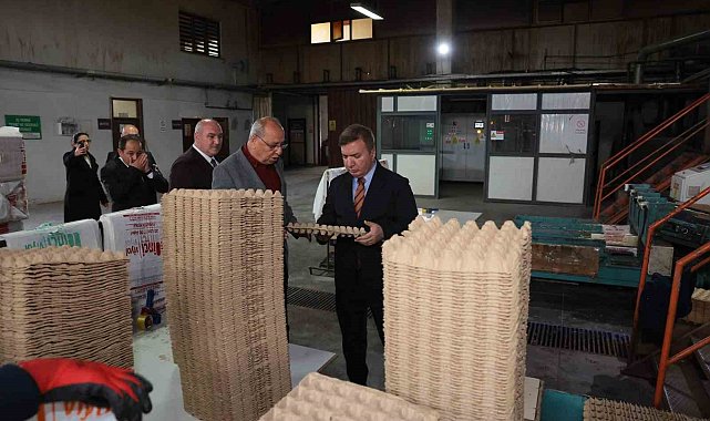 Üretim alanlarını gezen Vali Aydoğdu, tesiste 20 ve 30 adetlik yumurta viyollerinin üretim aşamalarını yerinde inceledi.