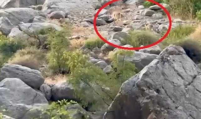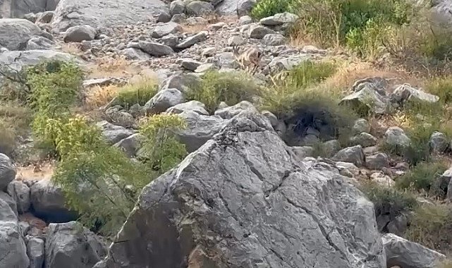 Kayalık bölgede gezen anne ve yavru keçinin, sarp yamaçlarda rahatlıkla ilerlediği anlar kameraya yansıdı. Görüntülerde, anne keçinin önde, yavrusunun ise hemen arkasında zıplayarak kayalıkları aştığı görülüyor.