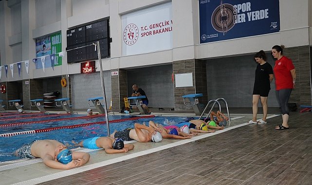 Yüzme kurslarına kayıt yaptıran vatandaşlar, vardiya halinde yüzme havuzuna giderek uzman antrenörlerden eğitim alıyorlar.