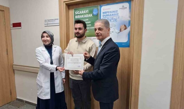 Erzincan İl Sağlık Müdürlüğü tarafından gerçekleştirilen etkinlik, Yunus Emre Mahallesi'nde bulunan Sağlıklı Hayat Merkezi Sigara Bırakma Polikliniği'nde yapıldı. Polikliniğe başvurarak tedavi sürecini başarıyla tamamlayan Muhammed Emin Cebeci'ye, İl Sağlık Müdürü Dr. Cihan Tekin tarafından başarı belgesi takdim edildi. Ayrıca, sigara bırakma polikliniğinde yürüttüğü özverili çalışmalardan dolayı Dr. Elif Pala Gün'e de teşekkür belgesi verildi.