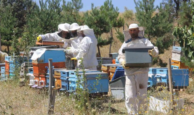 Erzincan'da, kavurucu sıcak altında giydikleri özel kıyafetler ve taktıkları maskelerle bal hasadı yapan arıcılar sezonun ilk hasadını yapmanın sevincini yaşıyor.