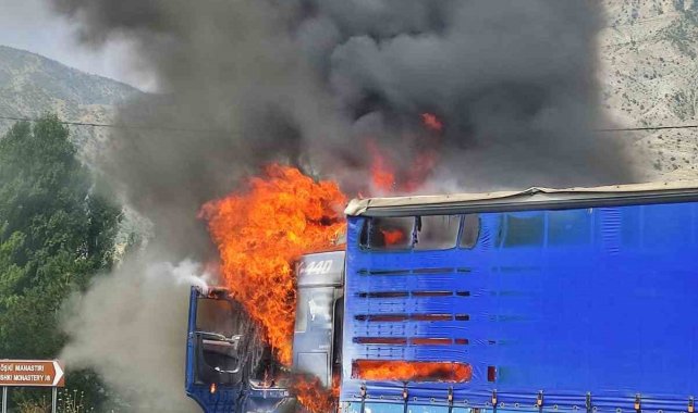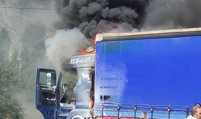 Erzurum'un Uzundere ilçesinden geçen Erzurum-Artvin karayolunda Gürcü plakalı bir tır, henüz belirlenemeyen bir sebeple aniden yanmaya başladı.