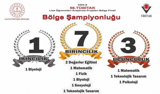 TÜBİTAK 2204-A 56.Lise Öğrencileri Araştırma Projeleri Yarışmasında 7 birincilik, 1 ikincilik, 3 üçüncülük elde eden Erzurumlu öğrenciler, Trabzon Bölge Finaline "Erzurum" mührünü vurdu.