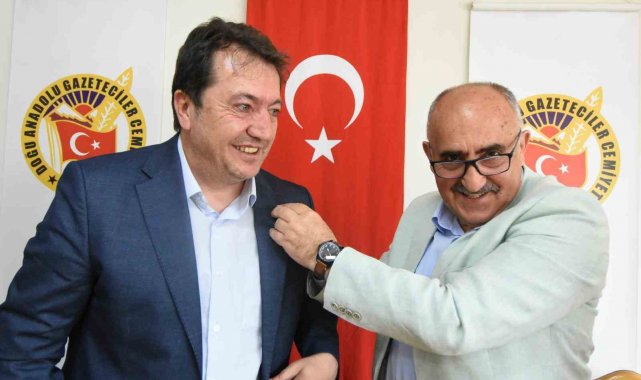 Başkan Tanfer, daha sonra Doğu Anadolu Gazeteciler Cemiyeti Başkanı Ayhan Türkez'e Kent Konseyi'nin rozetini taktı.