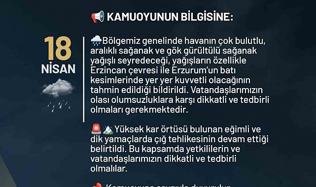 Bölge genelinde havanın çok bulutlu, aralıklı sağanak ve gök gürültülü sağanak yağışlı seyredeceği, yağışların özellikle Erzincan çevresi ile Erzurum'un batı kesimlerinde yer yer kuvvetli olacağının tahmin edildiği bildirildi. Yapılan açıklamada, daha sonra şöyle denildi, "Yüksek kar örtüsü bulunan eğimli ve dik yamaçlarda çığ tehlikesinin devam ettiği belirtildi. Bu kapsamda yetkililerin ve vatandaşlarımızın dikkatli ve tedbirli olmalılar"