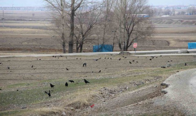 Erzurum'da Söğütlü Mahallesini istila eden kargalar, tarımla uğraşan va...
