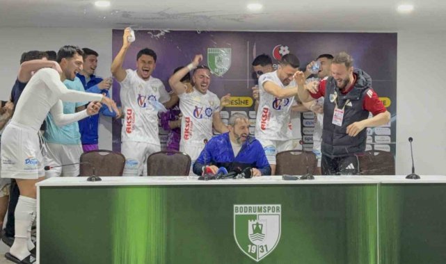 Erzurumspor Teknik Direktörü Serkan Özbalta'nın açıklama yaptığı sırada basın odasına giren futbolcular, teknik heyete su dökerek şampiyonluğu kutladı. Renkli anların yaşandığı toplantı kısa süreliğine dururken, kutlamanın ardından açıklamalara devam edildi.