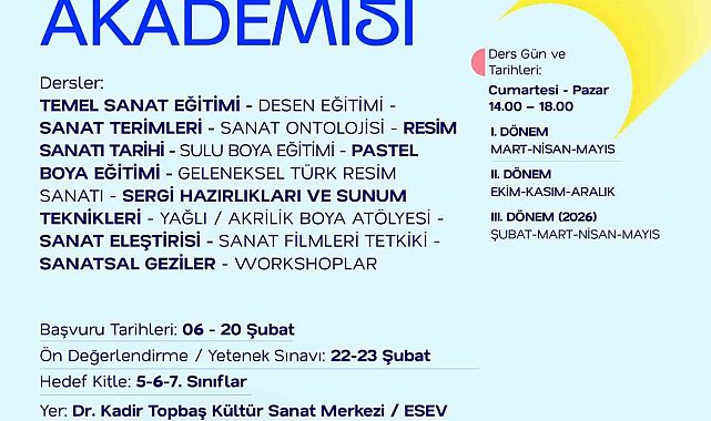 Esenler Belediyesi Sanat Evi (ESEV) bünyesinde eğitimlerine başlayacak Resim Akademisi'ne kayıtlar başladı. 20 Şubat'a kadar esev.org adresi üzerinden başvuruların devam edeceği akademide dersler, Dr. Kadir Topbaş Kültür Sanat Merkezi'nde gerçekleşecek. Akademide ön değerlendirme ve yetenek sınavı 22-23 Şubat tarihlerinde yapılacak. 5, 6 ve 7. sınıflara yönelik düzenlenecek akademide, temel sanat eğitimi, desen eğitimi, sanat terimleri, sanat ontolojisi, resim sanatı tarihi, sulu boya eğitimi, pastel boya eğitimi, geleneksel Türk resim sanatı, sergi hazırlıkları ve sunum teknikleri, yağlı / akrilik boya atölyesi, sanat eleştirisi ve sanat filmleri tetkiki dersleri işlenecek.