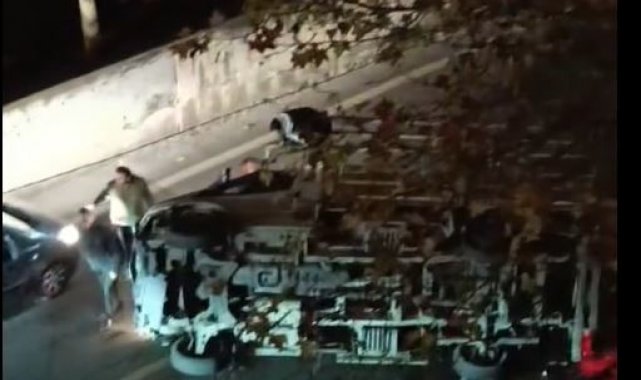İstanbul Esenyurt'ta alkollü olduğu iddia edilen kamyonet sürücü, makas atarken direksiyon hakimiyetini kaybederek bariyerlere çarptı. Dakikalar sonra ise yine makas atarak girdiği tali yolda aracını devirdi. Yaşanan kaza anları ise başka bir aracın kamerasına saniye saniye yansıdı.