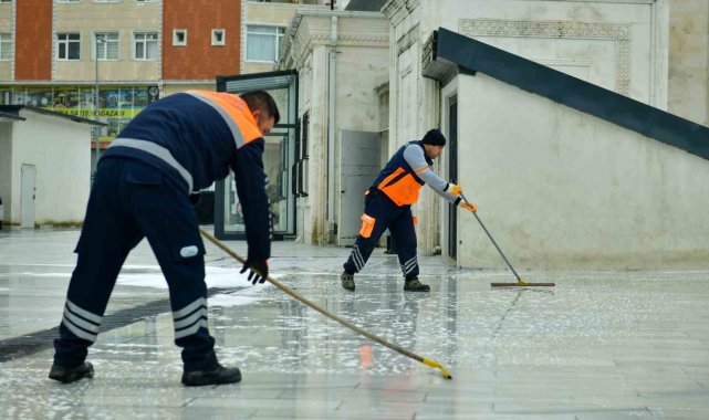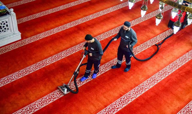 Halılardan mihrap ve minbere, kürsülerden pencerelere kadar camilerin tüm bölümleri özenle temizlenirken; abdesthaneler, şadırvanlar ve ortak kullanım alanları da dezenfekte ediliyor. Cami bahçelerinde çevre düzenlemesi ve genel temizlik çalışmaları da eş zamanlı olarak gerçekleştiriliyor.