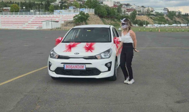 Tekirdağ'ın Süleymanpaşa ilçesinde eşinden boşanan bir kadın, yüzünü maske ile kapatarak arabasını süsleyip şehirde "Boşandım, mutluyum" turu attı.