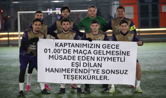 Ankara'da evlendikten sonra halı saha maçlarına gidebilmek için eşinden her zaman izin alamayan, son maç içinse son anda izin alarak maça giden Sami Can Gültekin'in takım arkadaşları, açtıkları pankartla Gültekin'in eşine teşekkür etti.