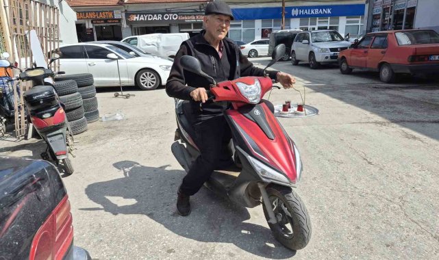 Eskişehir'de 44 senedir çay ocağı işleten 72 yaşındaki Cahit Çandemir, bir eline çay bardaklarıyla dolu tepsiyi alıp, diğer eliyle kullandığı elektrikli motosikleti ile dağıtım yapıyor.