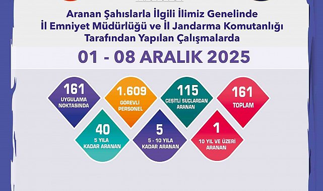 Eskişehir'de İl Emniyet Müdürlüğü ve İl Jandarma Komutanlığı ekiplerince 1-8 Aralık tarihleri arasında aranan şahıslarla yönelik il genelinde çalışma yapıldı. 161 uygulama noktasında bin 609 görevli personelle yapılan çalışmalarda; çeşitli suçlardan aranan 115, 5 yıla kadar aranan 40, 5-10 yıla kadara aranan 5, 10 yıl ve üzeri 1 olmak üzere, toplam 161 arana şahıs yakalandı.