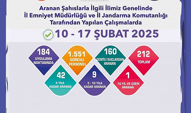 Edinilen bilgilere göre, İl Emniyet Müdürlüğü ve İl Jandarma Komutanlığı ekiplerince aranan şahıslarla ilgili çalışma yapıldı. 10-17 Şubat 2025 tarihleri arasında 184 uygulama noktasında gerçekleştirilen çalışmalarda bin 551 personel görevlendirildi. Ekiplerin çalışmaları sonucunda; çeşitli suçlardan aranan 160 şahıs, 5 yıla kadar aranan 42 şahıs, 5-10 yıla kadar aranan 9 şahıs ile 10 yıl ve üzeri aranan 1 şahıs olmak üzere toplam 212 şahsın yakalandığı öğrenildi.