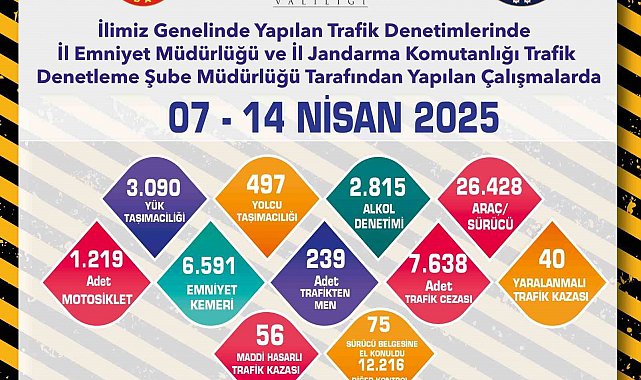 Edinilen bilgilere göre, İl Emniyet Müdürlüğü ve İl Jandarma Komutanlığı Trafik Denetleme Şube Müdürlüğü ekiplerince denetim yapıldı. Kent genelinde 7-14 Nisan 2025 tarihleri arasında yürütülen çalışmalarda; 3 bin 90 yük taşımacılığı, 497 yolcu taşımacılığı, 2 bin 815 alkol denetimi, bin 219 motosiklet, 6 bin 591 emniyet kemeri ve 12 bin 216 diğer kontrol türleri gerçekleştirildi. Ekiplerin 26 bin 428 aracın kontrol ettiği denetimler sonucunda 7 bin 638 adet trafik cezası kesilirken, 239 araç trafikten men edildi ve 75 sürücü belgesine el konuldu. Çalışmalar sırasında ayrıca, 40 yaralanmalı ve 56 maddi hasarlı trafik kazasına da müdahalede bulunuldu.