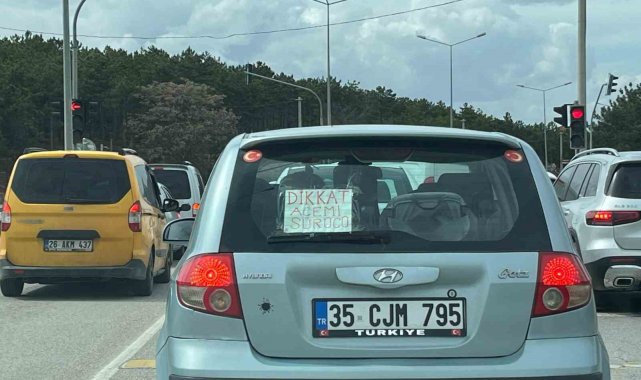 Eskişehir'in Büyükdere Mahallesi Nabi Avcı Bulvarı'nda trafikte seyreden bir aracın arka camındaki 'Dikkat Acemi Sürücü' yazısı görenlerin ilgisini çekti. Sürücünün, diğer sürücüleri uyarmak ve gülümsetmek amacıyla yazdığı not, trafikte farkındalık oluşturdu. Yazı, yoldaki diğer sürücülerin dikkatini çekerek kısa sürede ilgi odağı oldu.