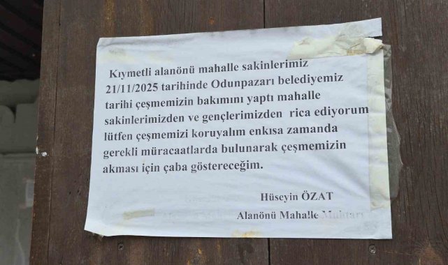"Kıymetli Alanönü mahalle sakinlerimiz; 21 Kasım 2025 tarihinde Odunpazarı Belediyemiz tarihi çeşmemizin bakımını yaptı. Mahalle sakinlerimizden ve gençlerimizden rica ediyorum; lütfen çeşmemizi koruyalım. En kısa zamanda gerekli müracaatlarda bulunarak çeşmemizin akması için çaba göstereceğim."