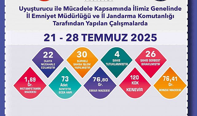 Eskişehir İl Emniyet Müdürlüğü ile İl Jandarma Komutanlığı ekipleri, 21-28 Temmuz 2025 tarihleri arasında uyuşturucuyla mücadele kapsamında yürüttükleri çalışmalarda önemli sonuçlar elde etti.