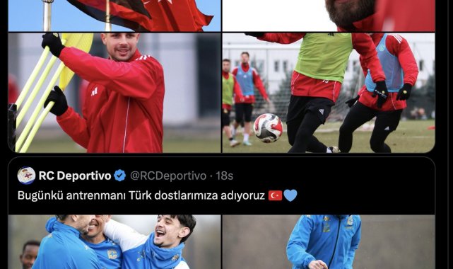 Türkiye ile İspanya arasındaki dostluk, son günlerde sosyal medyada gündem oldu. Bu konuyla ilgili bir paylaşım da İspanya 2. Lig takımlarından Deportivo'dan geldi. Deportivo resmi sosyal medya hesapları üzerinden Türkçe olarak 'Bugünkü antrenmanı Türk dostlarımıza adıyoruz' paylaşımı yaptı. Eskişehirspor tarafı ise bu paylaşımı alıntılayarak, iki ülkenin bayraklarının kullandığı paylaşımla cevap verdi.