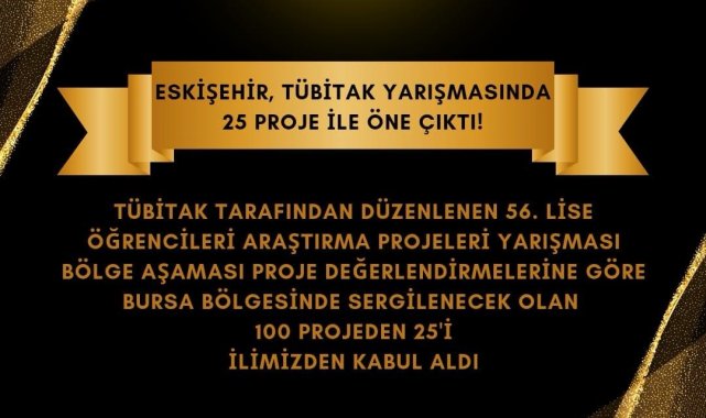Eskişehir, TÜBİTAK tarafından düzenlenen 56. Lise Öğrencileri Araştırma Projeleri Yarışması'nda önemli bir başarıya imza attı. Bursa bölgesinde sergilenecek 100 projeden 25'i Eskişehirli öğrenciler tarafından hazırlandı. Proje başvuruları, görevli jüri üyeleri tarafından değerlendirilmiş ve yapılan ön değerlendirme sonucunda 12 alanda toplam bin 200 proje bölge yarışmasına katılmaya hak kazandı.
