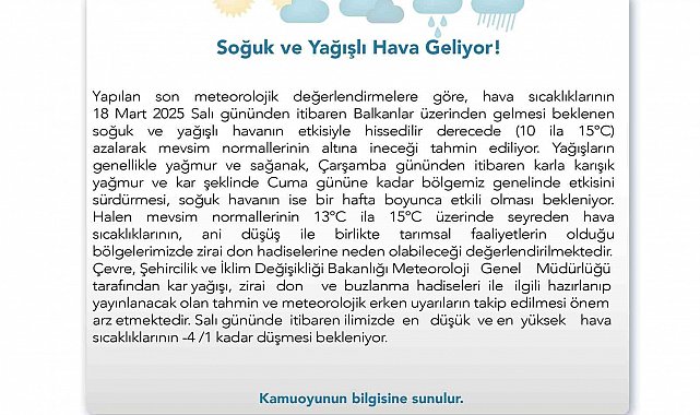 Çevre, Şehircilik ve İklim Değişikliği Bakanlığı Meteoroloji Genel Müdürlüğü tarafından yapılan açıklamada, "Kar yağışı, zirai don ve buzlanma hadiseleri ile ilgili hazırlıklı olunması, tahmin ve meteorolojik erken uyarıların takip edilmesi önem arz etmektedir. Salı gününden itibaren ilimizde en düşük ve en yüksek hava sıcaklıklarının -4/1C derece kadar düşmesi bekleniyor" ifadelerine yer verildi.