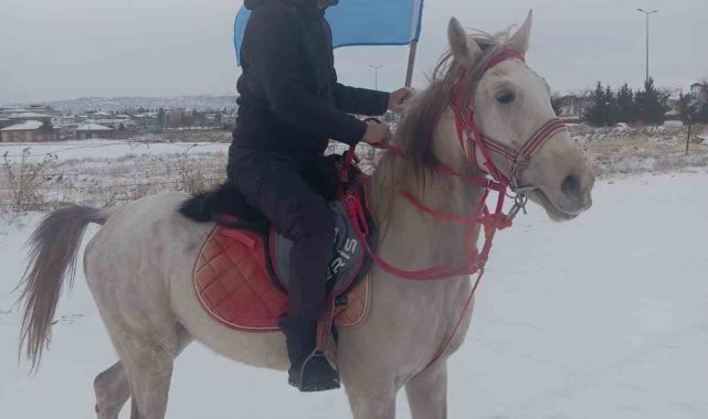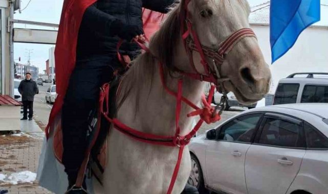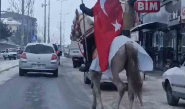 Kayseri'nin Tomarza ilçesinde bir esnaf, at üstünde sırtına astığı Türk bayrağı ve elinde Göktürk bayrağı ile tur attı.