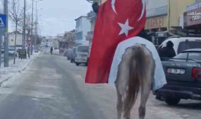 Esnaf at üstünde Türk bayrağı ile tur attı