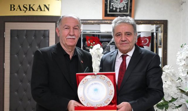 Başkan Yiğider, ESOB Başkanı Rasim Fırat'a ziyaret anısına çini tabak hediye etti.
