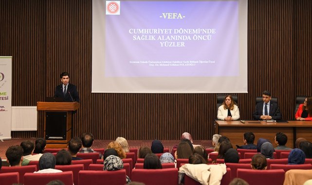 Edebiyat Fakültesi Öğretim Üyesi Doç. Dr. Mehmed Gökhan Polatoğlu ise "Cumhuriyet Döneminde Sağlık Alanında Öncü Yüzler" başlıklı sunumunda Cumhuriyet'in ilk yıllarından itibaren sağlık alanında önemli çalışmalar gerçekleştiren hekimler ve bilim insanlarının katkılarını ele alarak, Türkiye'de modern sağlık sisteminin gelişim sürecine öncülük eden isimleri ve bu isimlerin sağlık politikalarına olan etkilerini değerlendirdi.