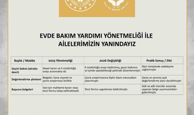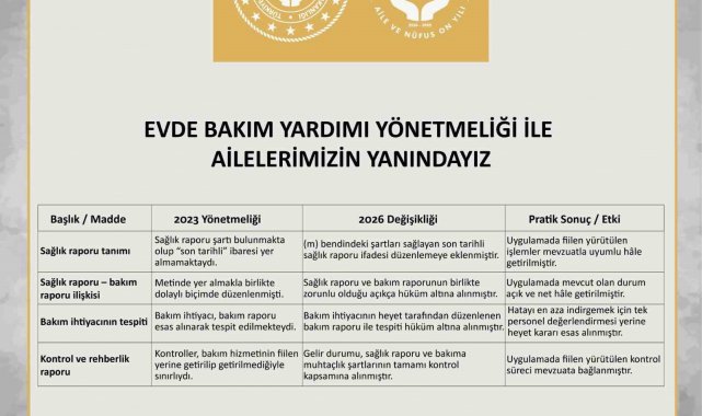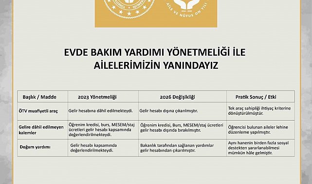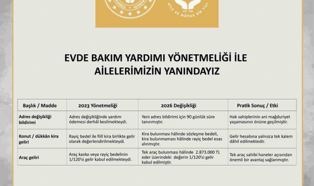 Buna göre, hane gelirinin hesaplanmasına ilişkin usul ve esaslar, evde bakımdan yararlananların lehine olacak şekilde yeniden düzenlendi. Değişiklik, özellikle taşınmaz, araç ve bazı sosyal ve eğitim destek ödemelerinin hane gelir hesabına dahil edilme biçiminde sadeleştirme ve netleştirme sağlayacak.