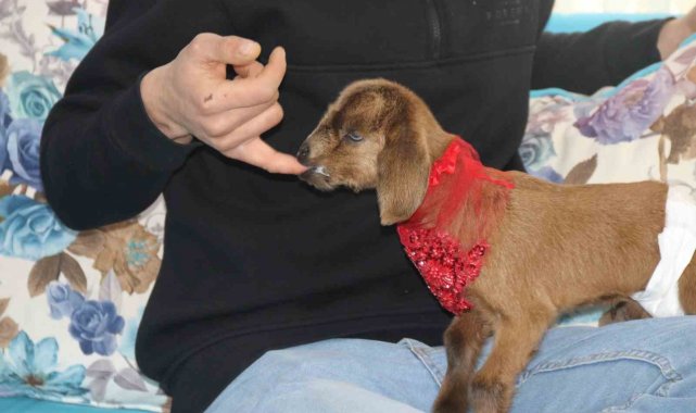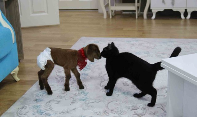 Eve aldığı keçi yavrusuna bebek gibi bakıyor