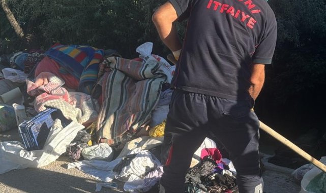 Kısa sürede olay yerine ulaşan ekipler, yılanın saklandığı noktayı tespit edebilmek için evdeki eşyaları dışarı çıkardı.