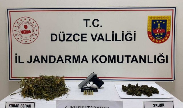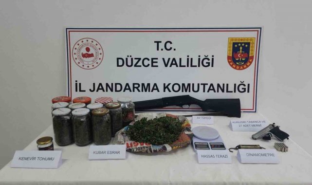 Düzce İl Jandarma Komutanlığı ekipleri Merkez ilçede jandarma sorumluluk sahası içerisinde 5 ayrı ikamette eş zamanlı aramalar yaptı. Aramalarda 97 gram kubar esrar, 10 gram kenevir tohumu, 4 adet av tüfeği, 2 adet tabanca, 355 adet çeşitli çaplarda fişek, 11 adet bıçak ve 1 adet muşta ele geçirdi.