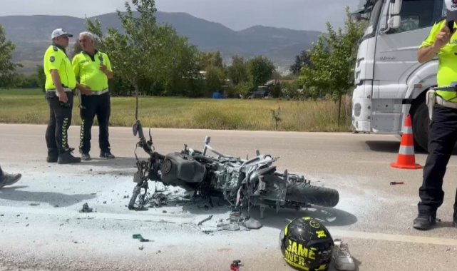 Kaza, Kırıkhan ilçesi Topboğazı mevkiinde yaşandı. Seyir halinde ilerleyen 43 ACF 748 plakalı motosiklet tırla çarpıştı. Çarpışma sonrası alevlere teslim olan motosiklet sürücüsü Emirhan Ç. yaralandı. Kazayı gören vatandaşlar durumu 112 Acil Çağrı Merkezi'ne bildirilmesi üzerine olay yerine jandarma, ambulans ve itfaiye ekipleri sevk edildi. Kısa sürede bölgeye gelen sağlık ekipleri, yaralıya ilk müdahalenin ardından hastaneye kaldırıldı. Evladının kaza haberini alarak olay yerine gelen yaralı gencin annesinin acı feryadıysa yürekleri dağladı. İtfaiye ekipleri, çarpışma sonrası alev alan motosiklete müdahale ederek söndürdü. Yaralı sürücünün hastanede tedavisinin devam ettiği öğrenildi.
