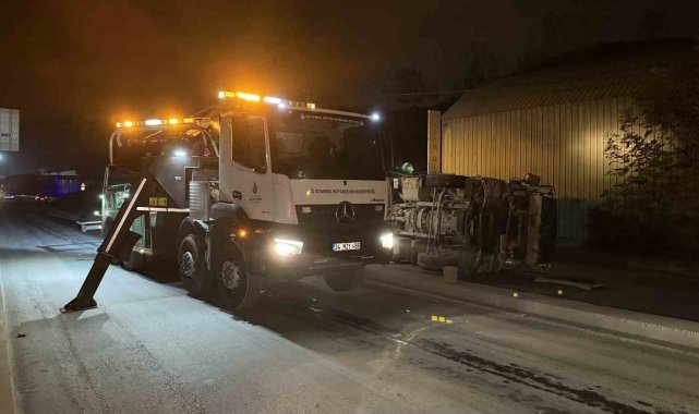 Eyüpsultan'da kontrolden çıkan hafriyat kamyonu yan yattı. 1 yaralı
