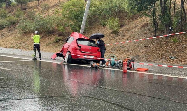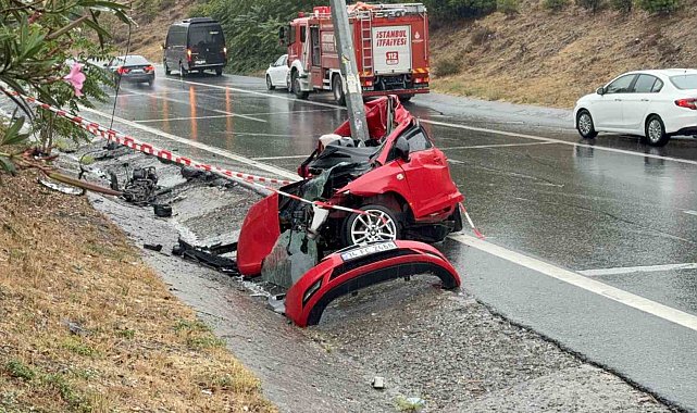 Eyüpsultan'da etkili olan sağanak yağış nedeniyle kayan yolda direksiyon hakimiyetini kaybeden sürücü aydınlatma direğine çarptı. Adeta kağıt gibi katlanan otomobilin içinde sıkışan sürücü Erkan Soytürk hayatını kaybetti.