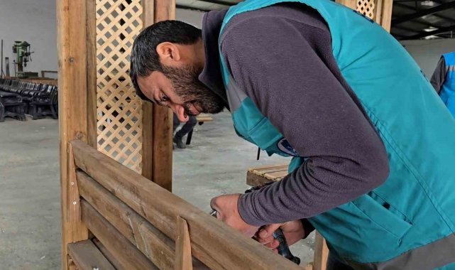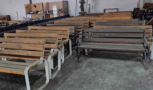 Eyyübiye Belediye Başkanı Mehmet Kuş'un kapasitesini artırarak yeniden yapılandırdığı ve yeni yerleşkesindeki atölyesini hizmete aldığı Çevre Koruma ve Kontrol Müdürlüğü, ilçe genelindeki parkların ihtiyacı olan bank, piknik masası, kamelya gibi açık hava mobilyalarını üreterek halkın istifadesine sunmaya devam ediyor.