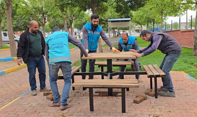 Eyyübiye Belediyesi, çeşitli nedenlerle kırılan ya da kimliği belirsiz kişilerce yakılan açık hava mobilyalarını atölyeye götürerek tamir edip yeniden yerlerine yerleştiriyor. Piyasadan temin etmek yerine kendi atölyesinde üretim ve tamirat işlerini yapan Eyyübiye Belediyesi, böylece önemli bir tasarruf da sağlıyor. İlçedeki tüm mahallelerin parklarını yaz aylarına hazırlamak için hummalı bir çalışma içerisinde bulunan ekipler, önceki gün de Eyyüpkent Mahallesi'ndeki parklarda çalışma başlattı. Çim ve ağaç eksikleri giderilen parklarda aydınlatma ve mobilya kurulumları da tamamlandı.