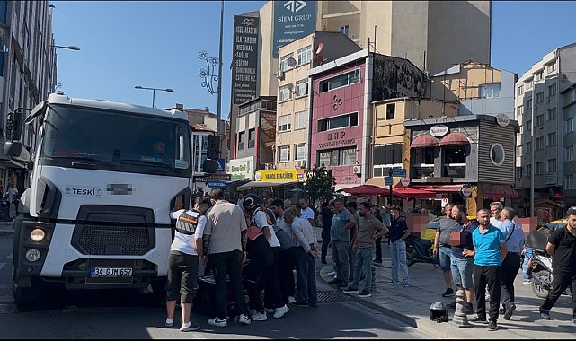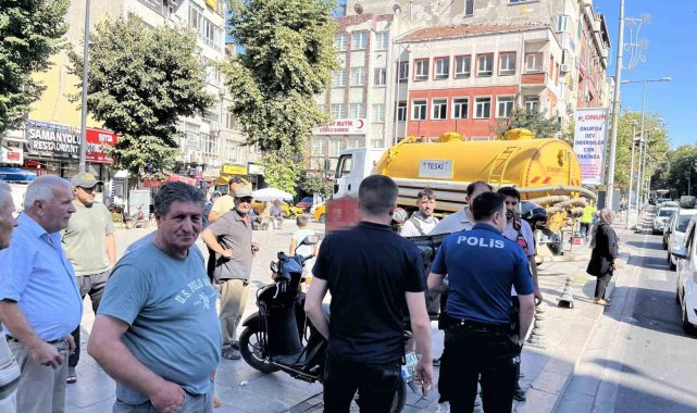Tekirdağ Çorlu'da Tekirdağ Büyükşehir Belediyesi Su ve Kanalizasyon İdaresi'ne (TESKİ) ait vidanjörün ezdiği motosiklette, sürücü kazayı kıl payı yara almadan atlattı.