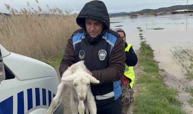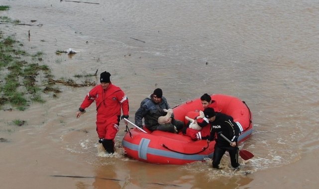 Çanakkale'nin Ezine ilçesinde sağanak yağış nedeniyle Menderes Çayı taştı. Hayvan kışlasında mahsur kalan Şahin Avcı, polis su altı arama ve kurtarma, Ezine Belediyesi itfaiye ve zabıta ekipleri tarafından yeni doğan 2 kuzu ile kurtarıldı. Kurtarma anı dronla görüntülendi.